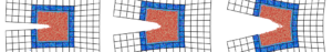 Figure 2: Capriccio simulation of mode I fracture of silica glass: Pure atomistic domain (red) coupled to a finite element region (black) via the bridging domain (blue), by Felix Weber (M. Sc.)